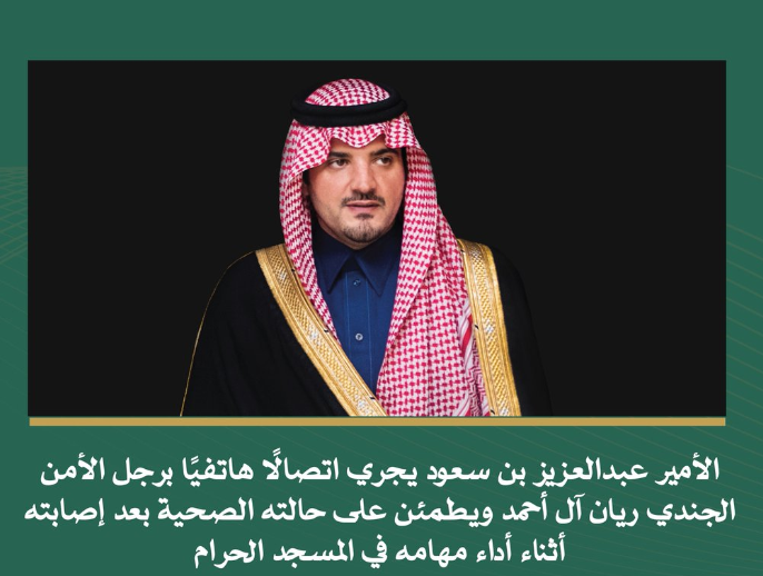 السعودية ـ 1447/07/06ــ الموافق 2025/12/26 م -الأمير عبدالعزيز بن سعود يجري اتصالًا هاتفيًا برجل الأمن الجندي ريان آل أحمد ويطمئن على حالته الصحية بعد إصابته أثناء أداء مهامه في المسجد الحرام.