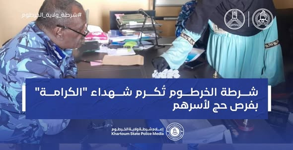 في لمسة وفاء وبتوجيه من الفريق شرطة حقوقي د سراج الدين منصور مدير شرطة ولاية الخرطوم نظمت شرطة ولاية الخرطوم ممثلة في ادارة التوجية والخدمات قرعة الحج لعام 1447هـ - 2026م والتي تم تخصيصها لأسر شهداء معركة الكرامة حيث جرت المراسم بحضور اللواء شرطة حقوقي سامي عبد الله أبو الحسن مدير دائرة الجنايات ومشاركة قيادات الإدارة وأسفرت عن فوز أسرتي الشهيد ملازم أول شرطة أحمد اللازم والشهيد الرقيب شرطة الغالي عيسى بأداء الفريضة لتؤكد قيادة شرطة ولاية الخرطوم بذلك التزامها الأخلاقي بتقدير تضحيات منسوبيها ورعاية ذويهم كنهج أصيل في مسيرتها.